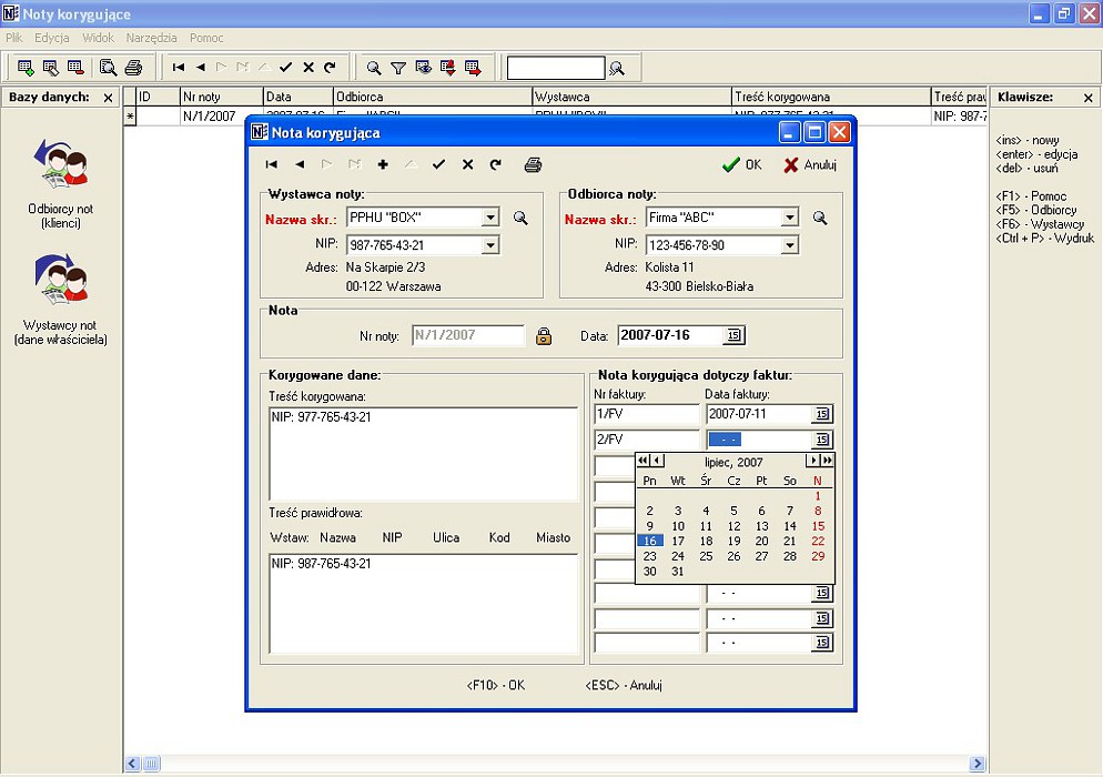 - Bazy danych: Wystawcy not, Odbiorcy not, Noty korygujące