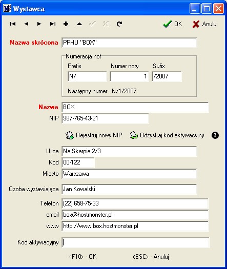 - wpisać kod aktywacyjny do zainstalowanego programu korzystając z menu „Widok > wystawcy not”.