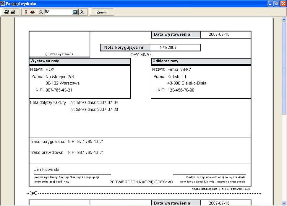 - Drukowanie i tworzenie noty korygującej.